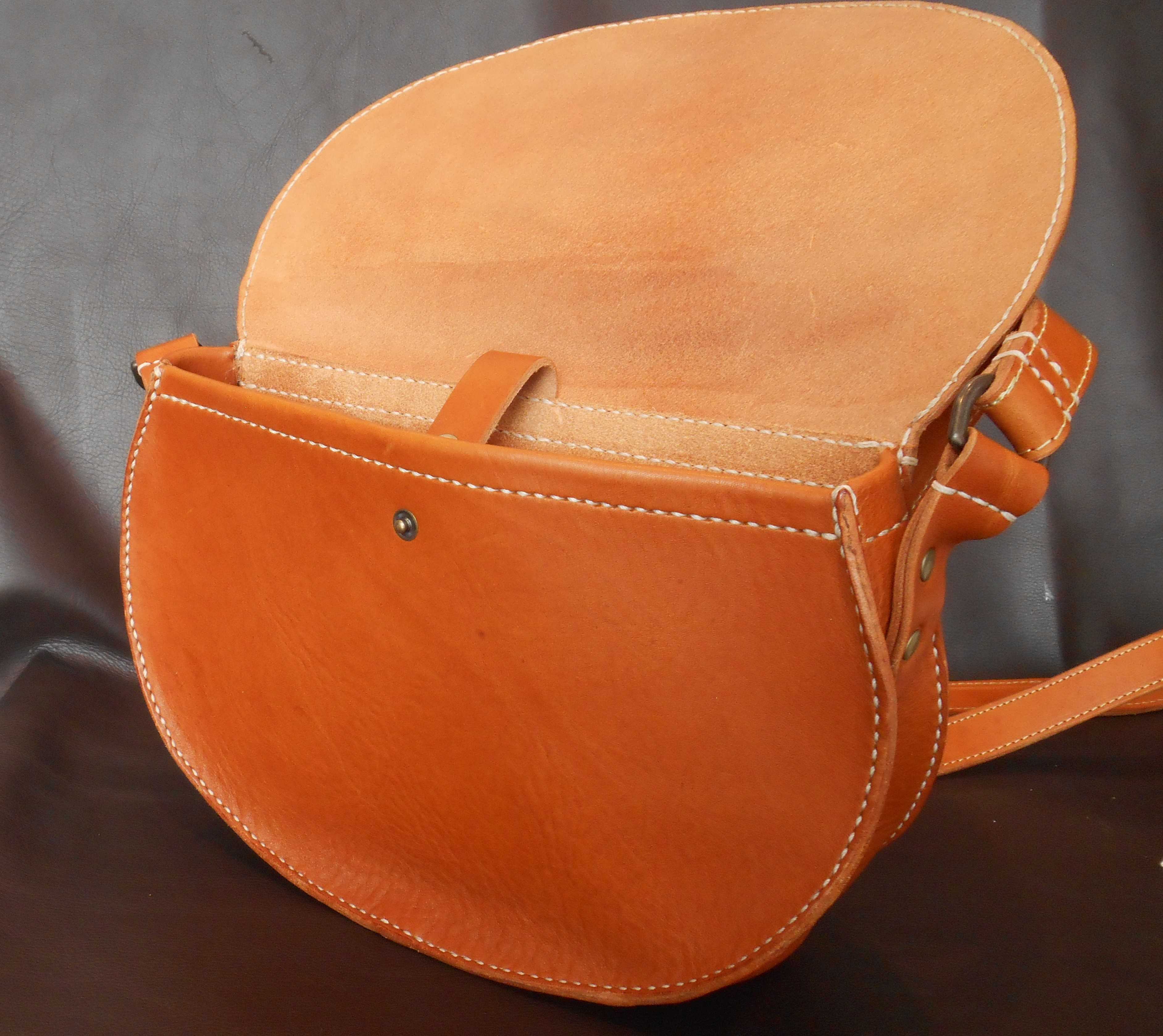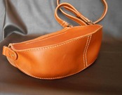 丁寧に手縫いされた半円形のメッセンジャーバッグ。ユニークなデザインでおしゃれ度アップ♪
